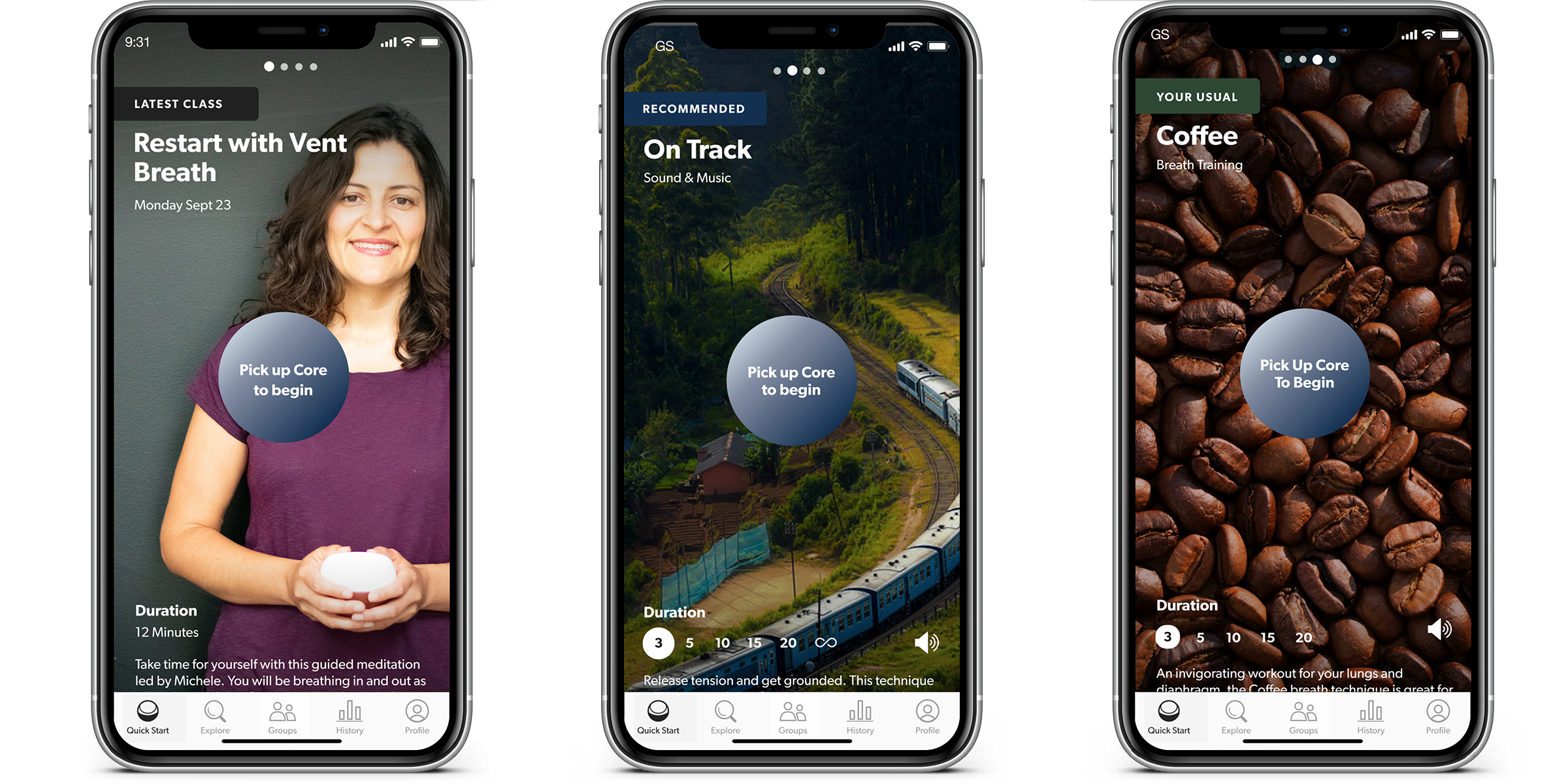 One of the guiding design principles of the Core app was to minimize the user’s time to immersion. For the user to build a consistent meditation habit, we believed that beginning a session should be frictionless: they should be able to just pick Core up and get started right away.